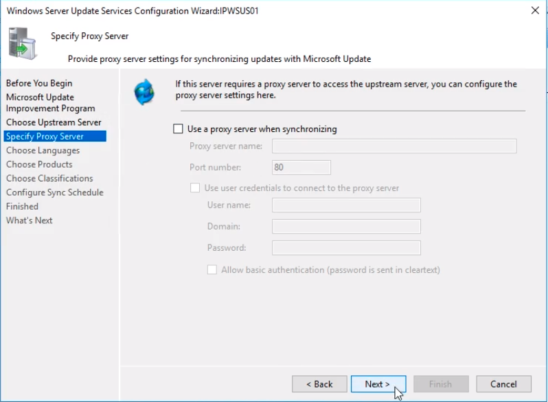 In the Specify Proxy Server window, we can enter proxy information for our network if we have one. Since we don’t have it in our lab environment we click Next.