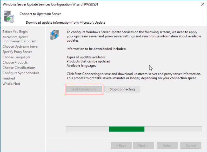Now in the Connect to Upstream Server window we need to test our connection by clicking the Start Connecting button. This will initiate a test process. This process takes around 5 minutes.