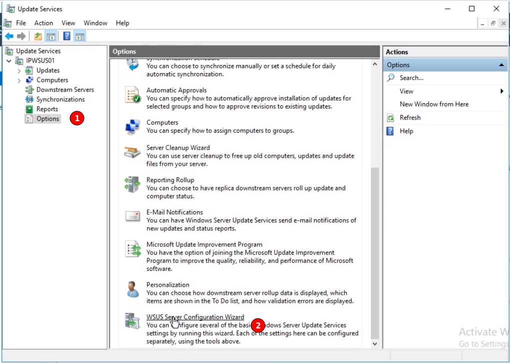 If you close the wizard and have WSUS open, you can navigate to Options (1) > WSUS Server Configuration WIzard (2).