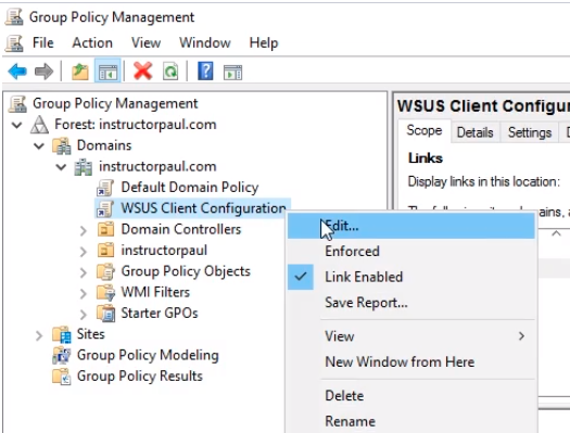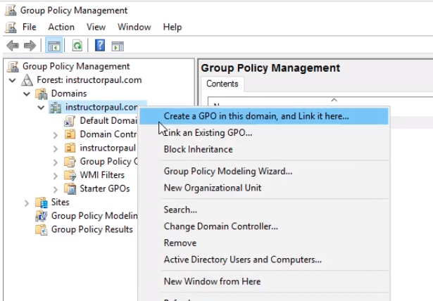 Expand the Forest: instructorpaul.com > Domains > instructorpaul.com. Right-click instructorpaul.com and select from the context menu Create a GPO in this domain and link it here...