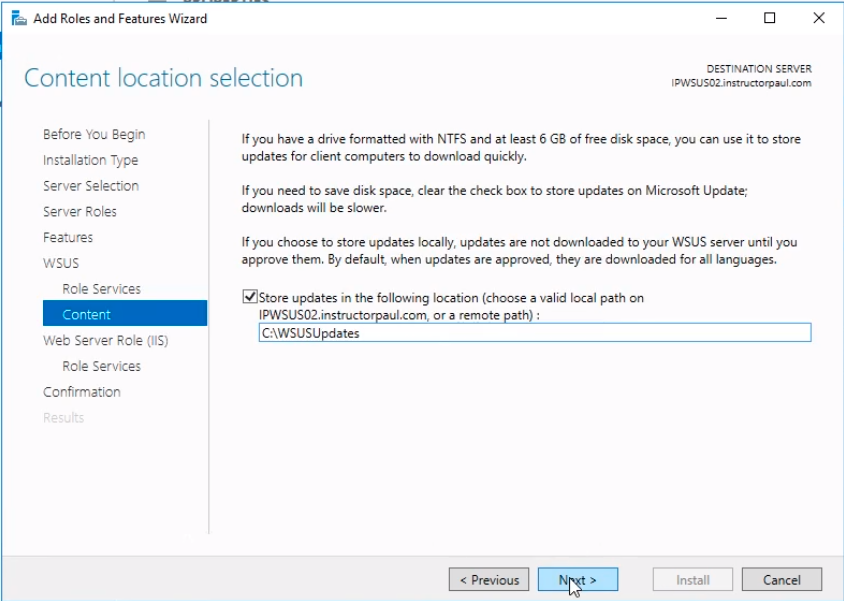 I am logged in to my IPWSUS02 server joined to my instructorpaul.com domain with IP Address 10.0.2.12 with no server roles installed yet.