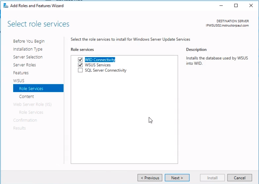 Click the Next button multiple times until we get to the Select role services. Here we leave the first two checkboxes checked as default for WID Connectivity and WSUS Services and click Next.