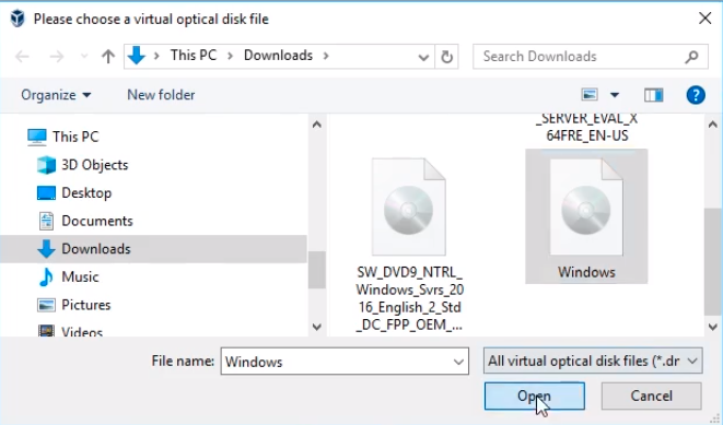 This opens a File Explorer window and we can see in our Downloads folder our Windows ISO file. This is my Windows 10 download. Select it and click Open.