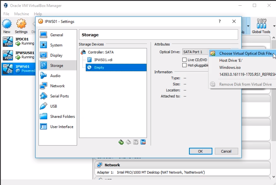 Click on Storage and we are going to mount the Windows 10 ISO. Select the Empty disc icon and then on the right hand side of the screen click on the Disc icon and click on Choose Virtual Optical Disk File...