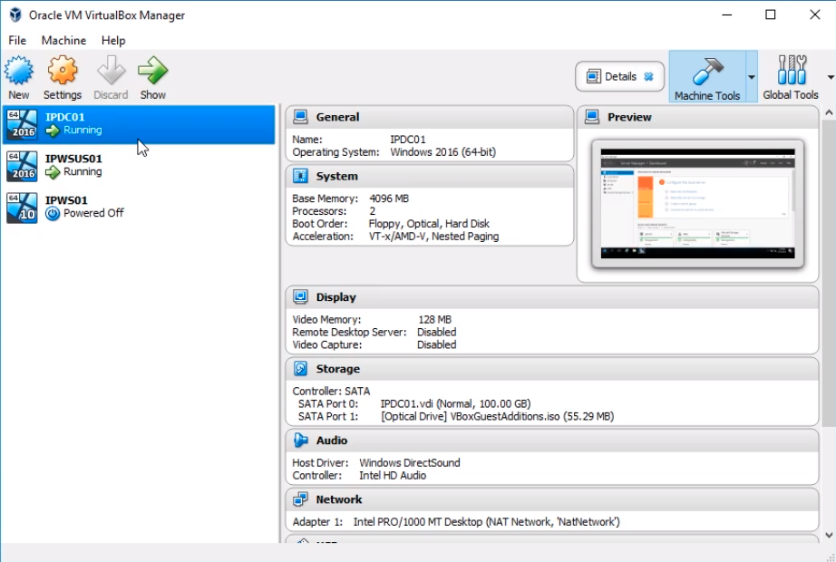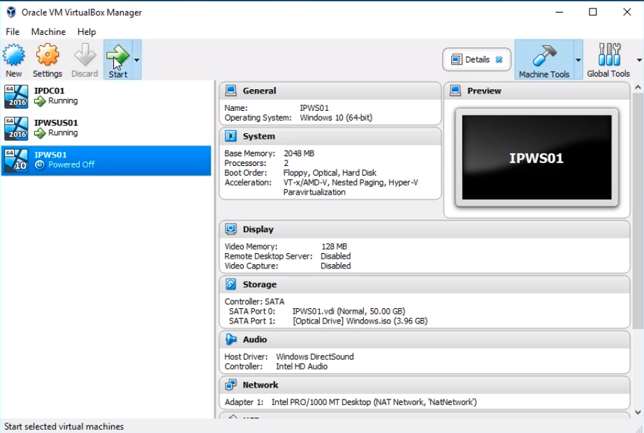 First thing I am going to do is open VirtualBox. I can see I have my IPDC01 Powered On and running, and I have my IPWSUS01 Server up and running. Now, the most important thing is that you keep your Domain Controller Running because once we are done installing Windows 10 we want to join this to our domain, so that will require that our Domain Controller is Powered On.