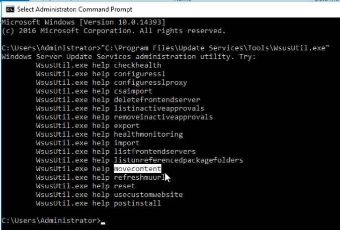 Type “C:\Program Files\Update Services\Tools\WsusUtil.exe” and press Enter to see the program options. We will use the movecontent option.