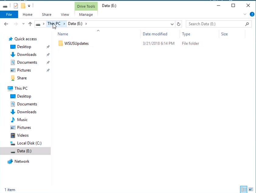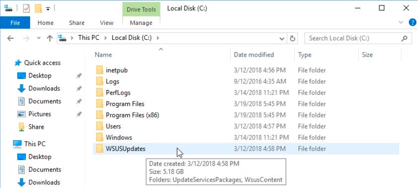 Create a new folder and name it WSUSUpdates. Make sure it matches with the C:\ drive folder. This does not necessarily need to match but when you’re running the command you need to create the folder ahead of time before you execute the move command.