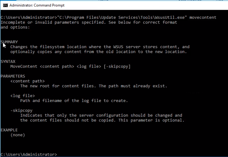 Press the Up arrow on your keyboard and complete it by typing “C:\Program Files\Update Services\Tools\WsusUtil.exe” movecontent and press Enter to see the arguments that we need to put for this command.