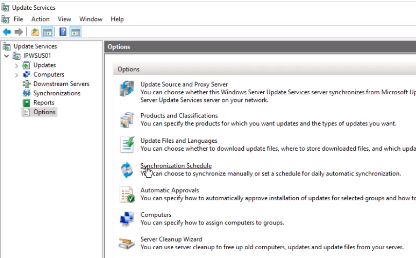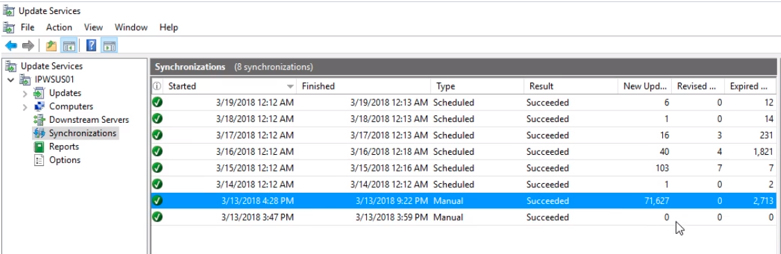 If we click on the Synchronizations tab to the left we can see more information. We notice the time when we run a Manual synchronization and downloaded all the information for those +7000 updates WSUS gathered meta-data about. We also noticed the Scheduled synchronizations and information on the New, Revised, and Expired updates.