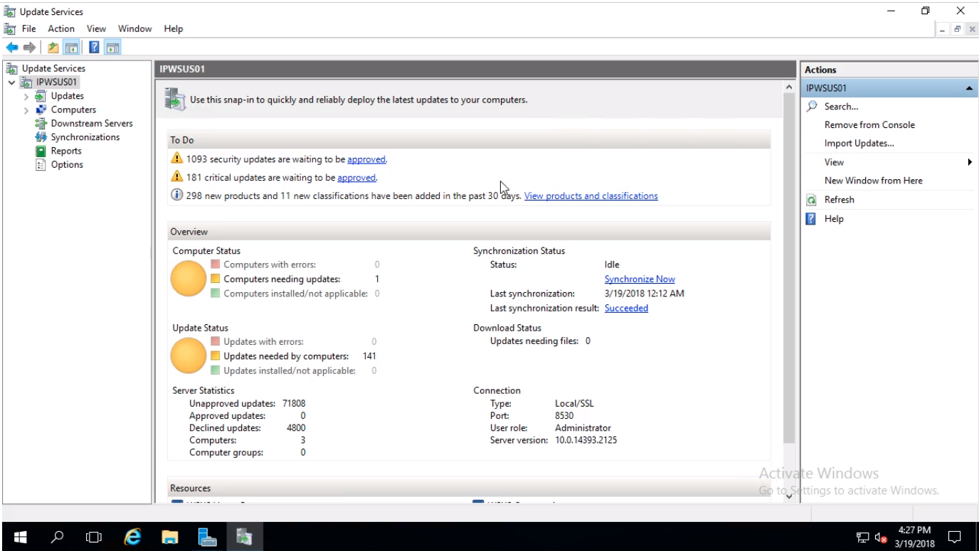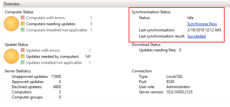 We can see from the WSUS Dashboard that we have in the center pane the WSUS Overview. Zooming in we notice the Synchronization Status section and the Last synchronization time and date and the Last synchronization result as succeeded.