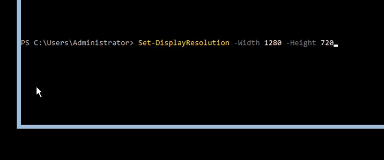 The first thing we are going to do is set the resolution with the command Set-DisplayResolution -Width 1280 -Height 720 and press Enter.