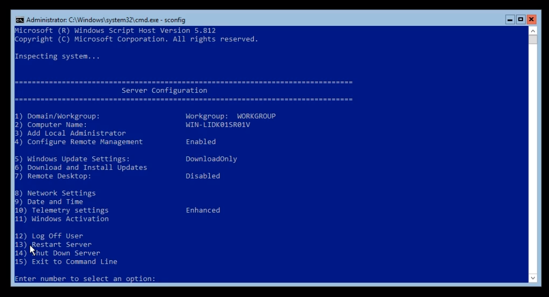 Now, when we configure a Windows Server Core we use sconfig. Type sconfig and press Enter.