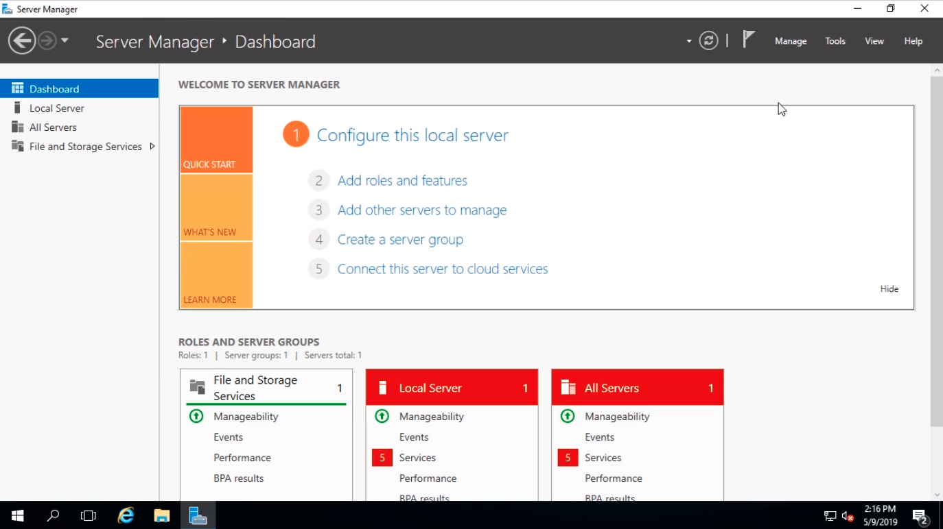 After installing Windows Server we are brought to the Windows Desktop and Server Manager will show up by default.