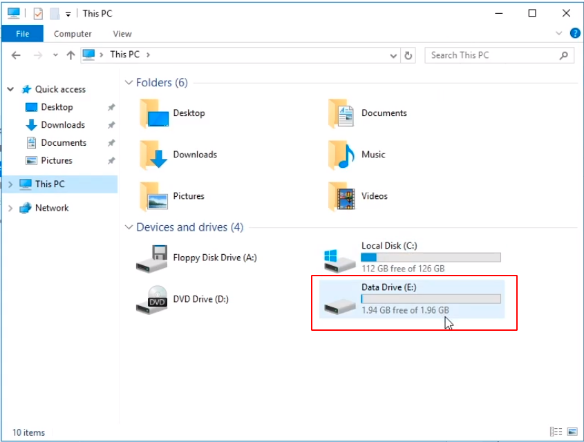 In our specific case we can back up to the local disk D:\ which wouldn't work because that’s actually a DVD drive. The other option we have is the E:\ drive. If we check File Explorer we can quickly see our drive size and available space. The problem is that our E:\ drive is only 2 GB in size and we are backing up 15 GB.