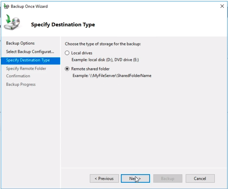 Now, in the Specify Destination Type we ideally would be saving the backup to a remote storage location.