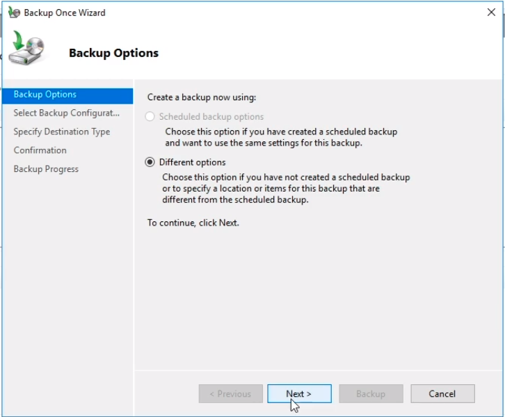 The only option available is Different options. The Scheduled backup options is grayed out since we haven’t configured any scheduled backups. Click on Next to continue.