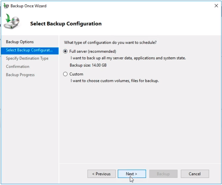 We can choose either a Full server (recommended) backup or a Custom backup.