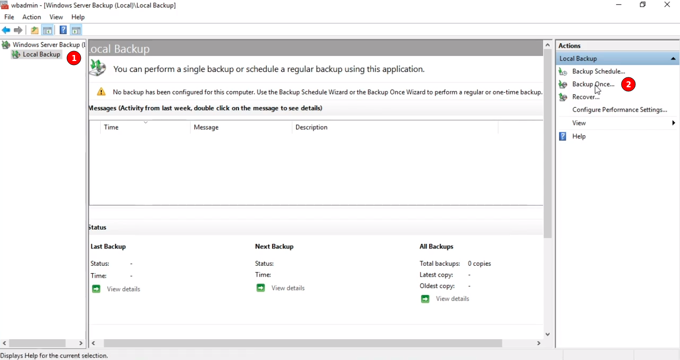Log into the DE01 server and open the Windows Server Backup Console and click on the Local Backup (1) option from the left pane and then Backup Once (2) from the right pane under Actions.