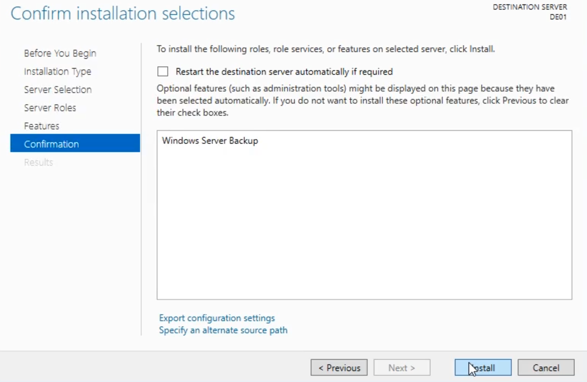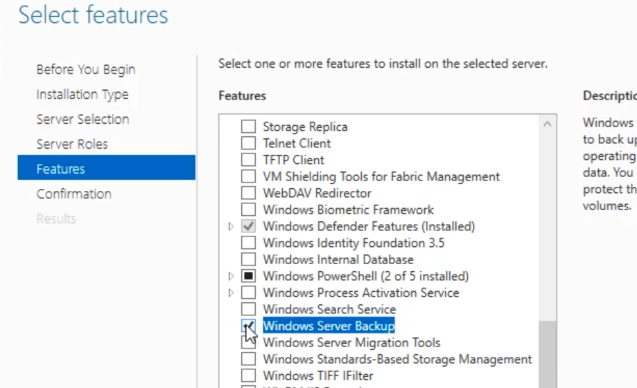 - Now lets head to features and scroll down to Windows Server backup feature checkbox