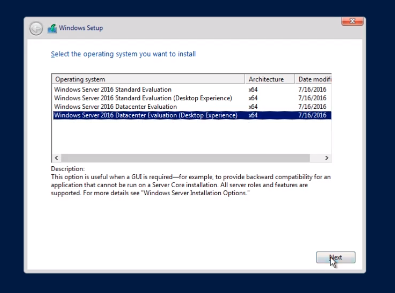 A lot of times the version you choose depends on what kind of license you have. If you do this in a lab environment, you can just choose the Datacenter Evaluation. The options Datacenter Evaluation and Datacenter Evaluation (Desktop Experience) depends if you want the Server Core or the Full Desktop GUI.