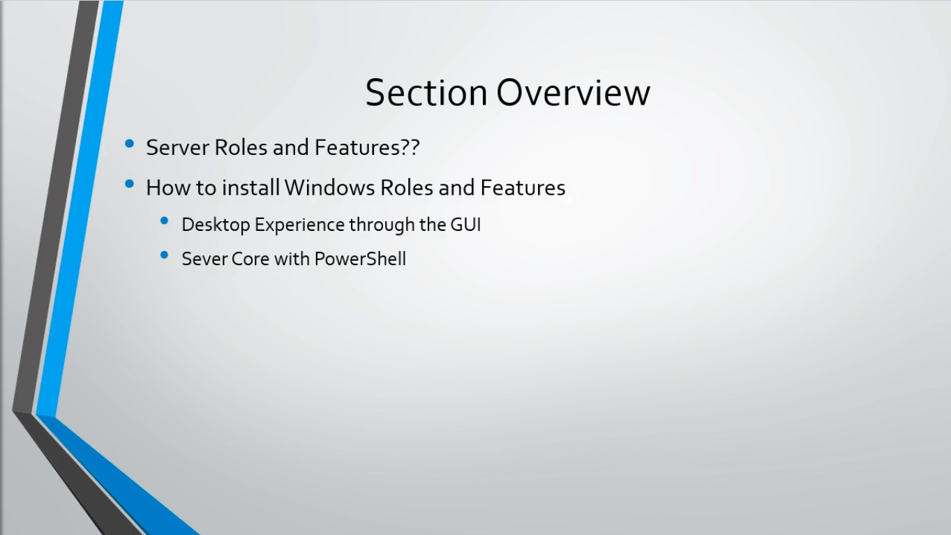 In this section you are going to be learning about Windows Server Roles and Features, what they are and how they are used before you learn how to install Windows Server Roles and Features, both on the Desktop Experience through the Graphical User Interface, or the GUI, and on Server Core with PowerShell.