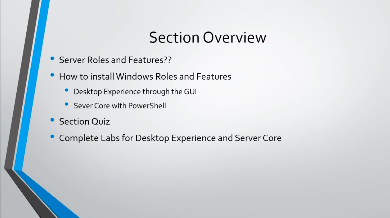 Next, you are going to have a Section Quiz and we are going to wrap up this section by having you complete a series of labs to install a particular Server Role and Feature on both the Desktop Experience and the Server Core.