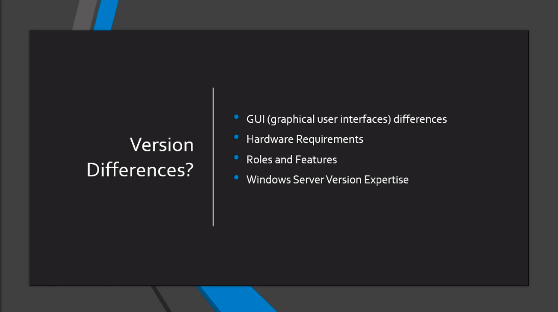 What I want to talk about is the differences in the Graphical User Interfaces, the differences in the Hardware requirements, is it different when installing Roles and Features when you are working on these different versions? and also most importantly, do your skills from one version of Windows Server transfer to another version of Windows Server?