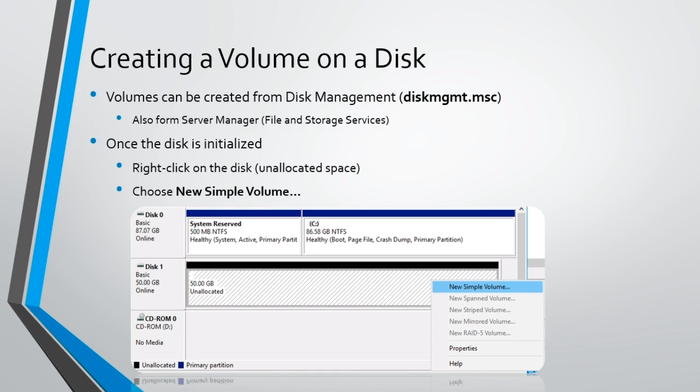 Now, this is going to be done with the diskmgmt.msc utility, just like when you are initializing the disk. It can also be done from Server Manager inside of the File and Storage Services tab.