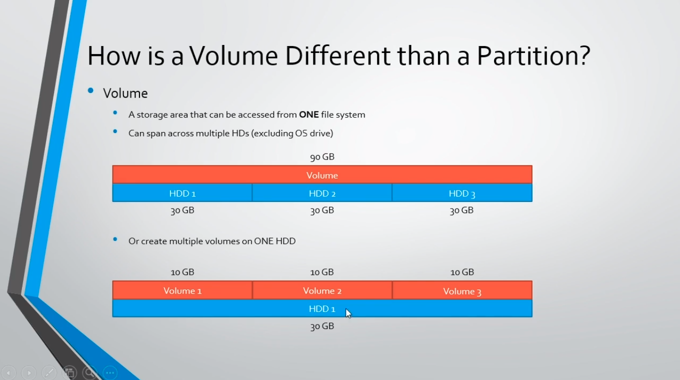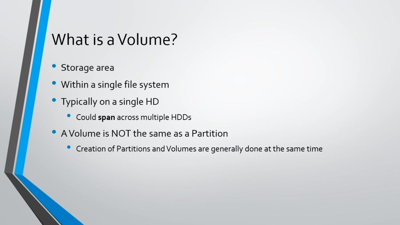 Now, a Volume is not the same as a Partition. I want to explain the differences because this can be confusing to some of my students. So, even though a Volume is not the same as a Partition, the creation of a Partition and Volume is generally done at the same time.