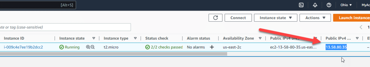 In the AWS Console, right-click your instance's Public IPv4 Address and select Copy :