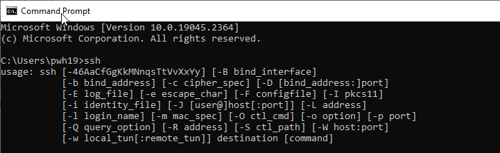 If you will be connecting from a Linux based operating system, it's very likely that you already have SSH installed. If you're on an old outdated version of Windows, however, you might now have SSH enabled. To double check, launch Command Prompt and type the command SSH. If you see output like that below, you have SSH and connecting will be very easy!
