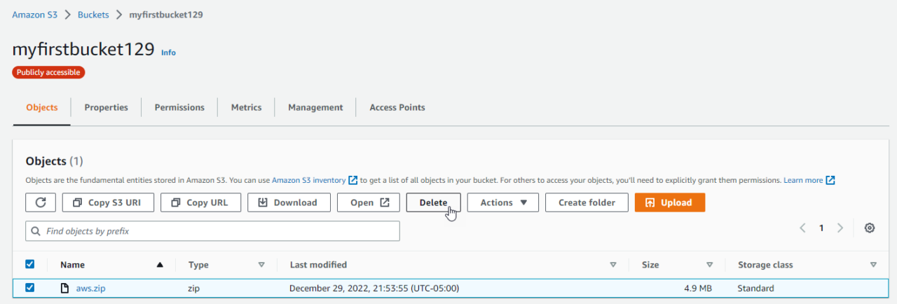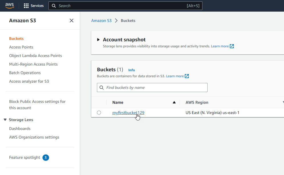 To delete an object, first, choose the bucket that contains the object you want to delete. In my case, I will be selecting the myfirstbucket129 :