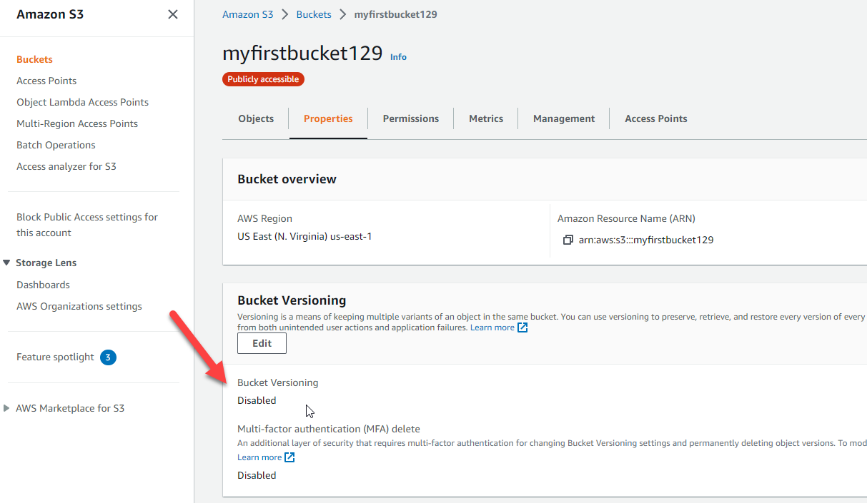 Next we should see if we have bucket versioning enabled or not. We can do that by going to the properties tab and scrolling down to note if we have bucket versioning enabled or not for this bucket.