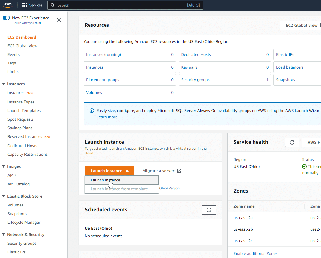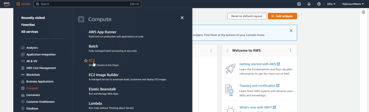 To begin, log in to your AWS account and go to the EC2 dashboard by clicking on the "Services" menu at the top of the page and selecting "EC2" under the "Compute" category: