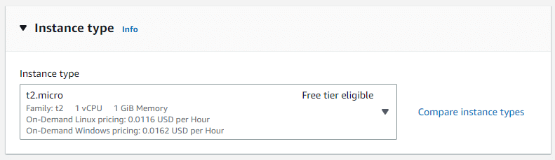 Under Instance type , t2.micro should be selected by default which falls under the free tier so we will chose this option: