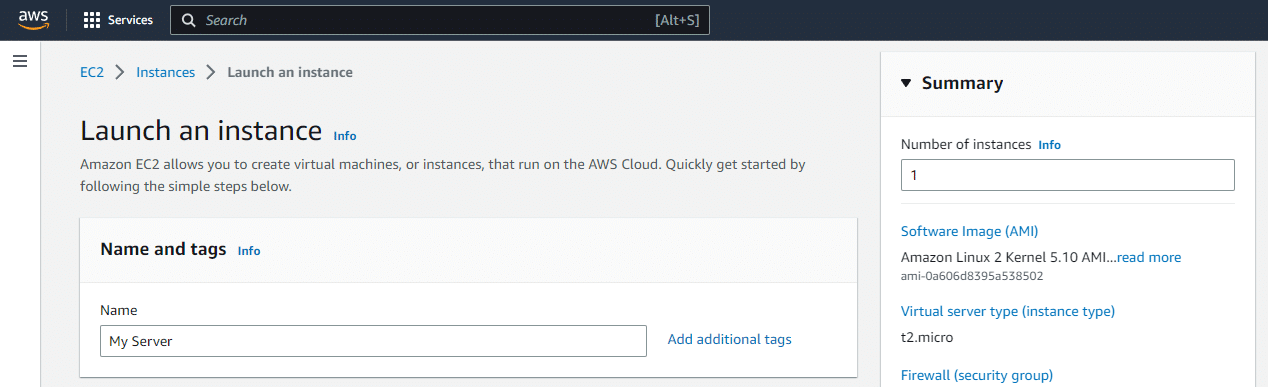 Under Name and tags specify a name for your EC2 instance. I am going to name it AmazonLinux after the OS: